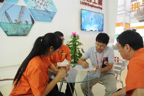 在集团展位现场,工作人员热情接待来自国内外的参展客商,详尽介绍了集团的发展概况和集团设计研发、装备制造、工程建设等情况,沟通对方关注的问题,并和对集团产业板块感兴趣的客户进行深入的沟通洽谈。