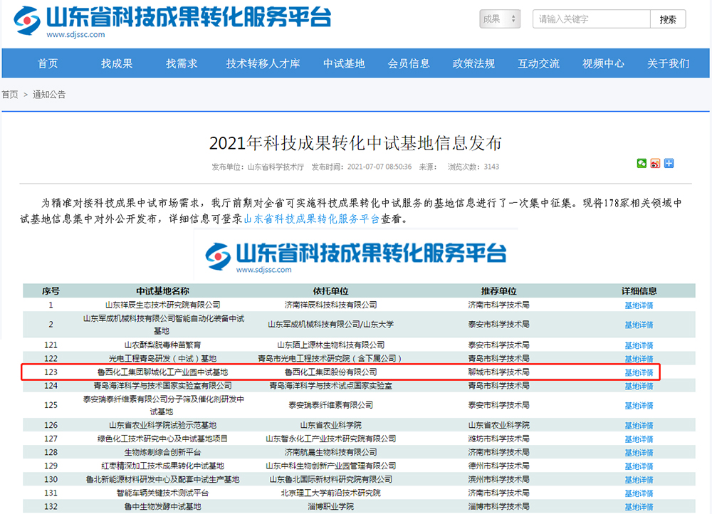 鲁西化工集团聊城化工产业园中试基地进入山东省科技成果转化服务平台